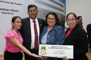Acompañado por Miguel Ángel Hernández Espejel, titular de la Secretaría de Educación, Ciencia, Tecnología e Innovación (SECTI), en representación de la gobernadora Delfina Gómez Álvarez, el dirigente recordó que desde 1952 el SMSEM ha trabajado “Por la Educación al Servicio del Pueblo”.